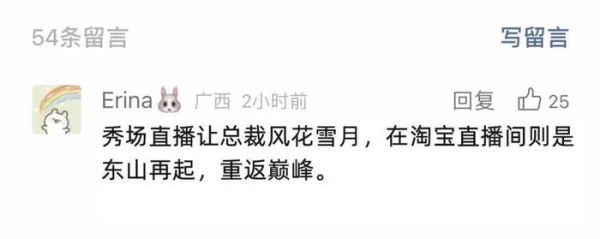 网友笑称,“秀场直播让总裁风花雪月,在淘宝直播间则是东山再起,重返巅峰。”