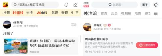 当天下午,张朝阳早早在搜狐新闻APP“时间线”、搜狐视频APP“关注流”中发布了跑步预告。直播中,跑步多年的张朝阳保持自己一贯的运动节奏,并向擅长攀岩的周鸿祎传授跑步技巧。他强调一定要先慢后快、小步高频,让心脏和四肢永远频率协调,尤其呼吸特别重要,要吸三下吐三下,每次和脚步相扣,才能为身体持续供给燃料。周鸿祎调侃自己练习攀岩只锻炼了上肢,对张朝阳感慨“你跑得真轻松啊!”