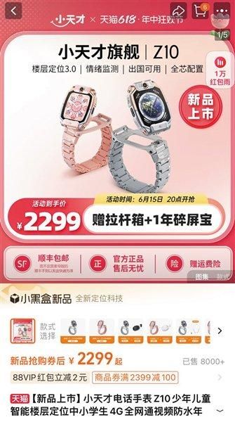 6月8日,小天才天猫旗舰店显示,Z10手表到手价2299元,已售超过8000单。在京东旗舰店,该款产品显示已售超过5000单。在小天才天猫旗舰店,最畅销的一款机型为Q2A儿童电话手表,售价599元,显示超过20万人付款。
