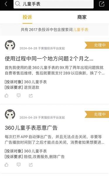 黑猫投诉平台显示儿童手表相关投诉超2600条