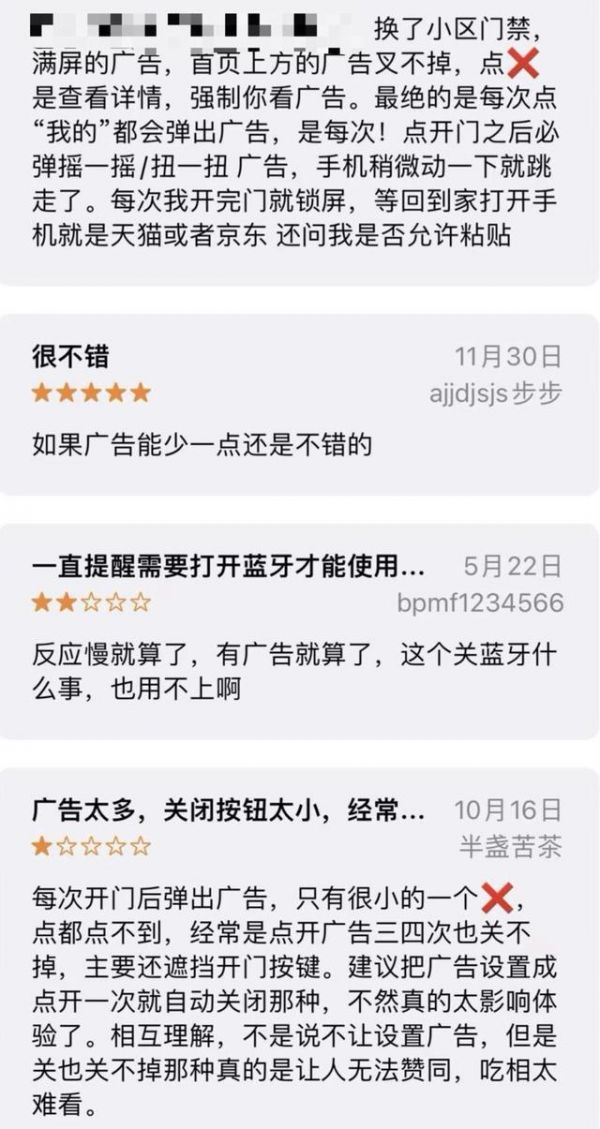 杨女士居住的静安区达安花园使用的是“亲邻开门”App。每次打开App时,开机界面弹出的“摇一摇”广告令她心烦不已,“传统的那种静止开机屏广告,等几秒就过去了,现在我必须得保持手不动,否则就立马跳到别的平台了。”在这款应用的下载界面,评论区也满是吐槽声,有用户直言App里“满屏的广告,首页上方的广告关不掉,属于强制看广告,而每次开门后必弹摇一摇/扭一扭广告,回到家手机屏幕要么是天猫要么是京东。”