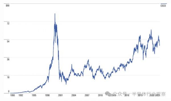 思科公司股价自1990年上市后,十年间上涨逾千倍,于2000年3月27日达到每股80美元的高位。但随后受互联网泡沫破灭的重创,2002年10月8日跌至每股8.60美元的低位。