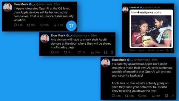 不过还得是马斯克,“苹果有难,老马点赞”,那边刚开完WWDC24,这边马上连发多条推文开炮:苹果不够聪明,无法开发自己的AI,但却有能力确保OpenAI将保护你的安全和隐私,这显然是荒谬的。一旦将你的数据交给OpenAI,苹果也不知道将来会发生什么,他们这么做完全是在出卖用户。