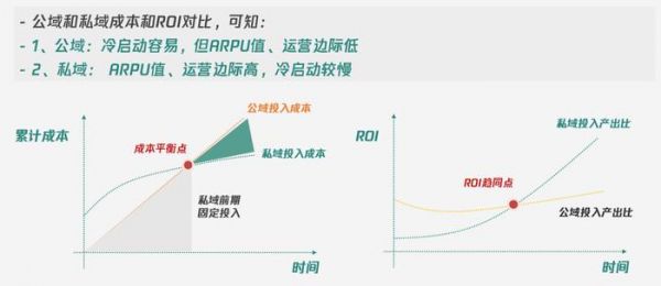 以公域和私域的成本和ROI对比为例,从长周期来讲,公域冷启动,刚开始投入对比私域基建成本要少,但长期ROI持续走低,私域后续成本投入更低和ARPU也更高。