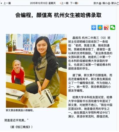郭文景,还是当年的升学神话。2015年作为浙江第一个被哈佛本科提前录取的学生,央视称她为“天才少女”。