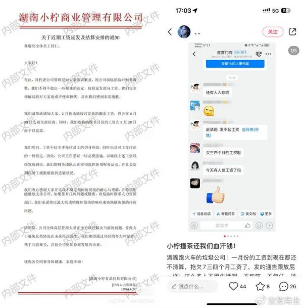事实上,早在二月,小柠撞茶的暴雷便有迹可循。社交平台上流传的内部通知显示,今年2月起,小柠撞茶就开始拖欠员工工资,虽多次承诺会在5月前发放,但时至今日,仍有大量员工未能拿到2月份的工资。