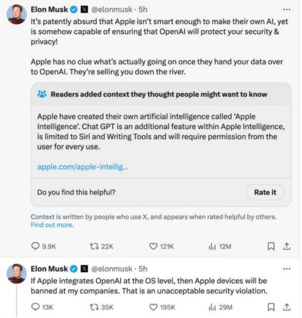 马斯克认为,苹果的这种做法是对用户隐私安全的不尊重,并表示,如果苹果在操作系统层面整合 OpenAI,那么苹果设备将被我的公司禁止使用。这是不可接受的安全违规行为。