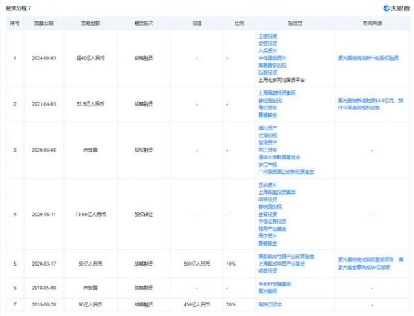 另据天眼查,2021年4月,紫光展锐也已经融资53.5亿元,投资方包括上海国盛资本、碧桂园创投、海尔金控、赛睿资本等。