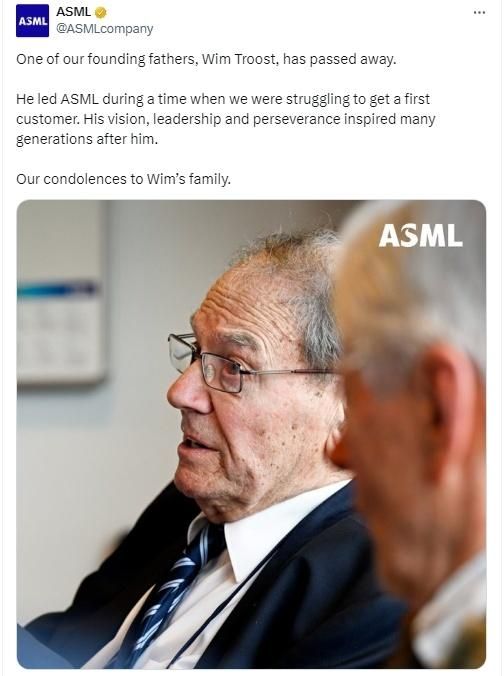 据报道,阿斯麦在社交平台上发布悼文称,“我们的创始人之一维姆・特鲁斯特去世了。在1987年至1990年期间,他担任首席执行官,当时阿斯麦正在努力争取第一个客户。退休后,特鲁斯特仍然是阿斯麦和高科技产业的真正大使。他激励了后世的许多人。我们感谢特鲁斯特为阿斯麦强大的公司文化所做的贡献,以及他的领导能力、毅力和远见。我们向特鲁斯特的家人表示哀悼。”