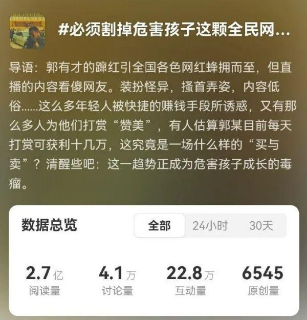 近日,某家媒体主持的热搜话题“必须割掉危害孩子这颗全民网红毒瘤”短时间内冲上热搜第一。但什么叫“全民网红毒瘤”?“危害孩子”这个动宾搭配的词组,怎么跟“毒瘤”在词义上并列?评论区很多网友吐槽:语文是谁教的,AI都写不出这种病句。这个“病”得不轻的热搜话题,是新闻业务严重退化的缩影。