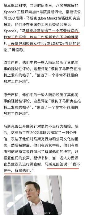 8名 SpaceX前员工起诉马斯克:性骚扰、实施报复[吃瓜]马斯克回答说:我不在乎,解雇他们。