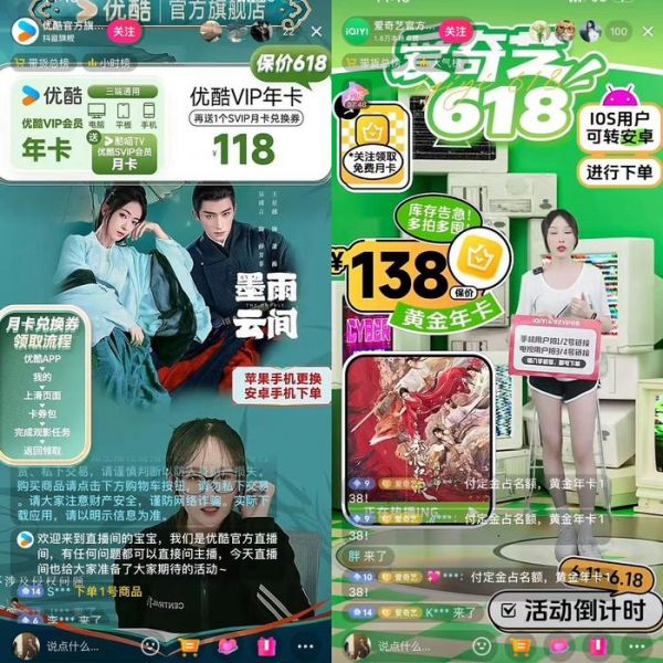 以抖音为例,618期间,为刺激用户消费,爱奇艺、优酷、腾讯视频等视频平台均在抖音直播间放出明显降价优惠,如爱奇艺黄金年卡只需要138元,相较标价238元降价超40%;优酷VIP年卡只需118元,相较标价258元降价超50%。