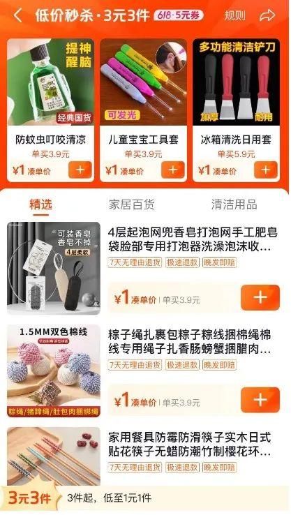 首页右上方还有“低价秒杀”专区,也有不少标着1元凑单价的商品。‘市界’点进去下单了一包筷子,发现当购买数量为“1”时,筷子价格是3.9元;购买数量为“3”时,筷子总价变成了3元,也就是单价到了1元。“低价秒杀”专区里,商品同样是包邮且赠送运费险,并承诺48小时内发货。