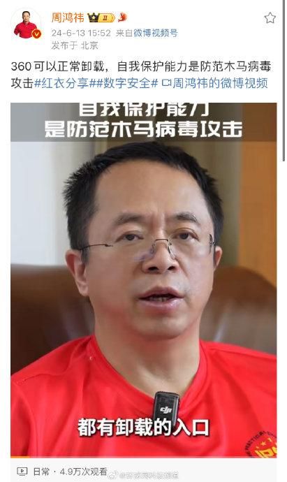 【#周鸿祎回应360不能正常卸载#】#周鸿祎称360卸载流程是为认证真人# 6月13日,@周鸿祎 发视频回应360安全软件不能正常卸载的谣言,周鸿祎称360安全软件完全可以安全卸载。他表示,360自我保护能力是防范木马病毒攻击,卸载流程繁琐是为认证是真人在卸载,因此不能一键卸载。