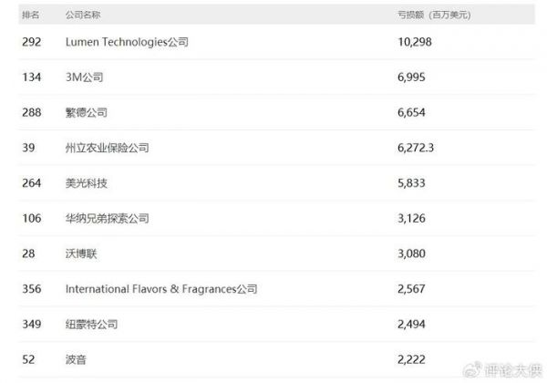 亏损榜单1-5名:Lumen Technologies公司、3M公司、繁德公司、州立农业保险公司以及美光科技。排在榜首的Lumen Technologies公司,年亏损金额达到102.98亿美元(折合人民币约746.7亿元)。企业专注于为商业客户和部分住宅用户提供广泛的通信解决方案,业务覆盖全球60多个国家和地区。其亏损原因包括但不限于供应链挑战、激烈的市场竞争、业务转型期间的成本以及高昂的研发支出。