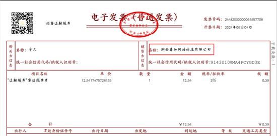 再以一笔在天津的打车订单为例,行程单显示服务商为神州专车精选司机,车型为神州精选司机经济型,但发票中的开票公司同样为湖南喜行网络科技有限公司。