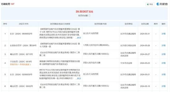 另外,关于其的行政处罚高达137个,累计处罚总金额超过39万元。其中大多是驾驶员未取得《网络预约出租汽车驾驶员证》、车辆未取得《网络预约出租汽车运输证》的情形。