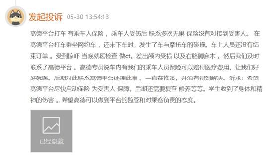 在黑猫平台上,存在着不少针对聚合平台司机资质、物品遗失、损失理赔等方面的投诉。一位用户就投诉称,在高德平台打车乘坐网约车,还未下车时,发生了车与摩托车的碰撞。就医后检查出颅内受损以及右胳膊麻木,起初高德客服专员说车内有乘车人员保险可以赔付医疗费用,但后期一直在推诿,并没有得到解决。