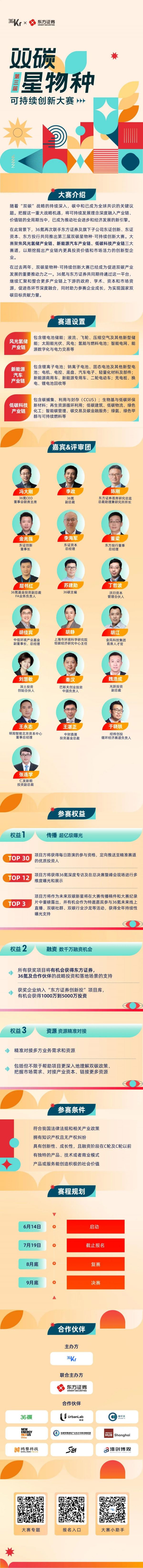 在国家双碳战略持续深入、可持续发展理念深度融入产业链、价值链全周期的背景下,东方证券及旗下子公司东证创新、东证资本、东方投行携手36氪共同启动第三届“双碳星物种·可持续创新大赛”。大赛聚焦“风光氢储产业链、新能源汽车产业链、低碳科技产业链”三大赛道,挖掘产业链内更具投资价值和市场活力的创新型企业,通过汇聚和整合更多产业链上下游的政府、学术、资本和市场资源,促进各环节深度融合,助力参赛企业成长,为实现国家双碳目标贡献力量。
