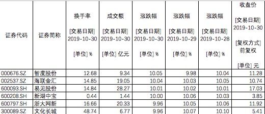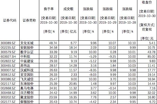 而从10月30日的换手率情况来看,虽没有前一交易日那么普遍高,换手率在20%的以上的区块链个股有14只,其中文化长城的换手率高达48.74%,居于首位,安妮股份(002235)、数字认证、中科软的换手率也超过30%。
