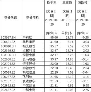 Wind数据显示,有多只概念股的换手率超过20%,如中科软(603927)的换手率高达55.66%,另外暴风集团(300431)、福光股份(688010)的换手率分别为41.6%和35.57%。