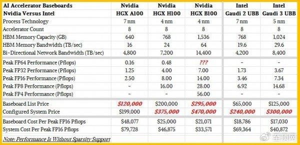 跟英特尔不同,我们会观察一段时间之内的趋势与更广泛的峰值理论性能,借此找出每单元对应算力与单位性能对应的售价(二者互逆)。为此,我们整理出一份小表格,将英伟达“Ampere”A100、H100以及Blackwell B100同英特尔Gaudi 2与Gaudi 3加速器进行了比较。双方均采用带有8个加速器的基板配置,具体如下: