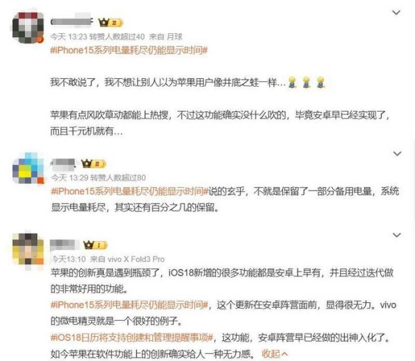 部分网友发表了自己的看法,小雷截选了一些比较具有代表性的评论,大家可以看到其中大部分人对 iPhone 新功能并不感冒,并认为安卓手机早就实现的功能凭什么上热搜,果粉实属大惊小怪。