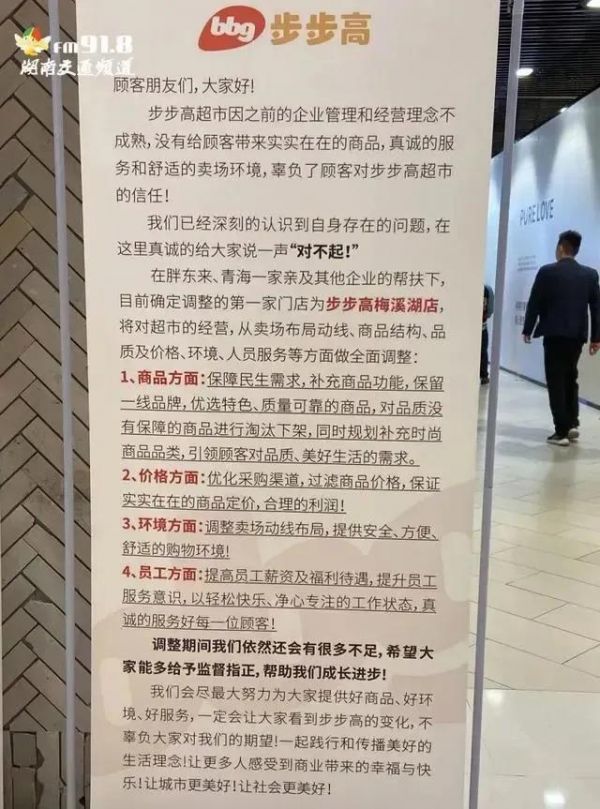 调改前,步步高在自己门店入口处张贴了一幅巨大的道歉信,对过去未能给顾客带来实实在在的商品、真诚服务和舒适环境深表歉意。在随后的一个多月的时间里,类似的道歉信步步高发了三封。
