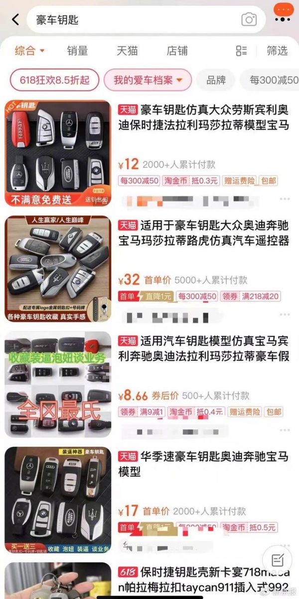 在某电商平台,有不少商家售卖豪车钥匙模型,价格从几元到上百元不等。网络截图