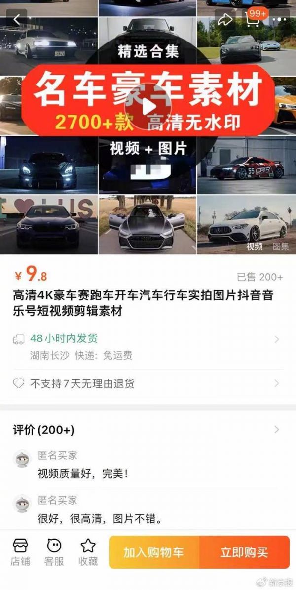 电商平台上,只需9.8元,就可以购买豪车行驶素材。网络截图