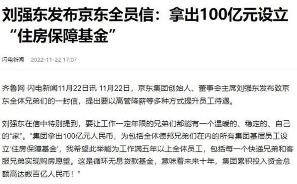 2022年,京东还拿出100亿设立了员工住房保障基金,给包含德邦物流在内的所有工作满5年的基层员工提供无息购房贷款。刘强东个人还拿出1个亿成立了“员工子女救助基金”,为遭受意外事故的员工抚养子女。