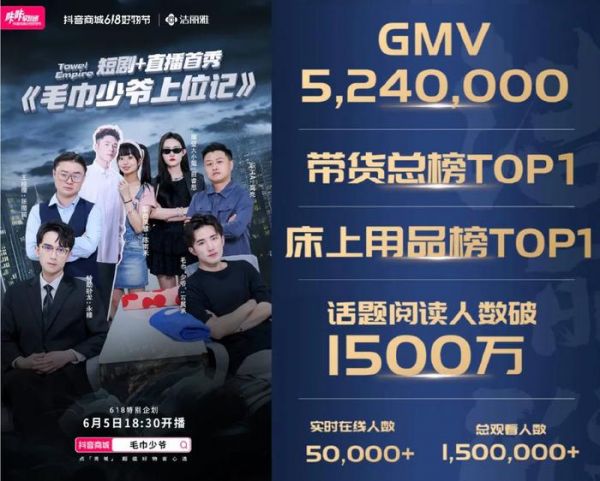 直播过程中,《毛巾帝国》的“反派二叔”也在恰好的时机现身,为直播间又叠了一层buff,将同时在线人数推至5万人以上。直播间的爆款内容成就了多个爆款单品,包括洁丽雅纯棉四件套、一次性洗脸巾、复古小碎花床单被套等都卖出了40万元以上,洁丽雅透气天丝纯色四件套更是卖出了近200万元。多款床上用品的热销直接助推“毛巾少爷”直播间登上当晚床上用品榜Top1。当晚,毛巾少爷直播间实时在线人数超5万,总观看人数超150万,最终GMV突破500万。整个直播和此前的特别企划《咔咔砍价团》一起斩获12个全网热搜。