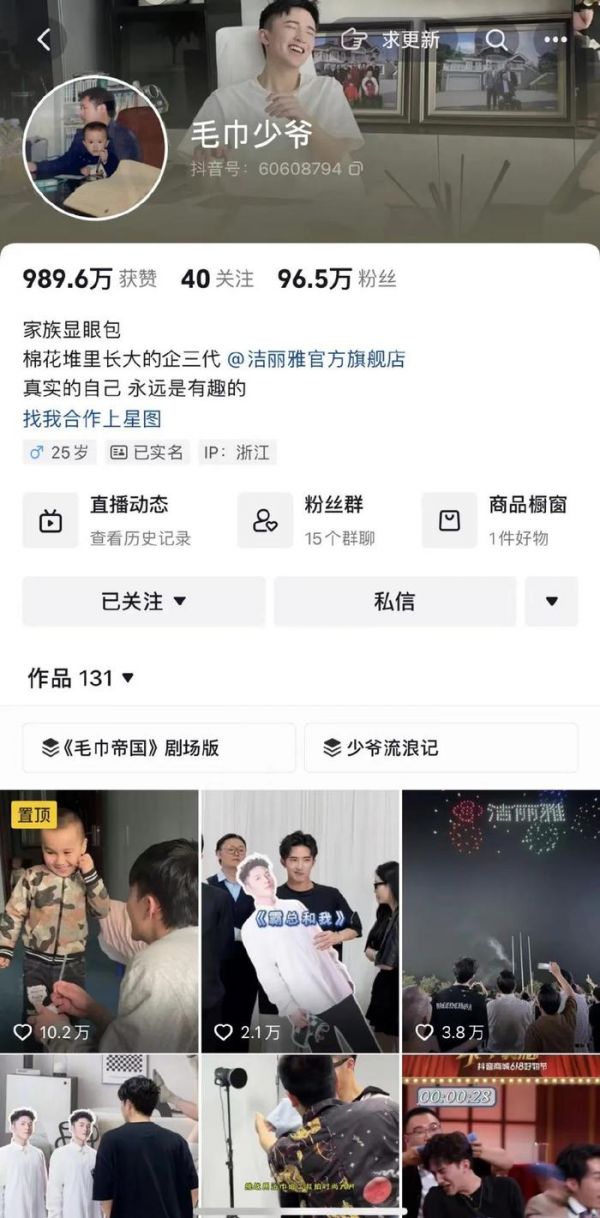 在内容上,毛巾少爷的成功也源自他的大胆尝试,几乎将抖音上的所有形式都尝试了个遍,从而找到了最合适自己的赛道。除了短视频拍段子和vlog之外,毛巾少爷还赶在短剧风口之时趁势将自己的家族故事“戏剧化”,拍出了大火的《毛巾帝国》。后来,“毛巾少爷”更是在与抖音电商的合作中,深度参与《咔咔砍价团》并借势开展短剧+直播的新型带货尝试。全域发力的内容策略,也帮助他尽可能地获取了来自各种渠道的粉丝群体。其次,毛巾少爷作为家族的第三代继承者,亲自入局去拍摄短视频为企业宣传,显然要比此前许多品牌的非家族主播要更具备说服力,也更能出成果。毕竟,毛巾少爷和洁丽雅品牌的利益深度绑定。作为家族的传承者,人们也天然对他具备好奇心,流量自然会向他倾斜。当然,好看的花朵需要适宜的土壤。最终毛巾少爷能够成功,也少不了抖音电商对新内容的持续探索和不断追求。甚至,毛巾少爷的短剧直播的尝试,和特别企划中的个人IP打造,也是平台方提供创意和深度参与的结果。如今,企业家做个人IP已经成为了一个显著的趋势,周鸿祎、雷军等众多企业创始人躬身入局,已经在抖音取得了相当的成果,收获了用户的好感和信任,甚至完成了产品的种草和蓄水。最近一年,不少企业家曾向刺猬公社(ID:ciweigongshe)坦言,在抖音做个人IP,可以高效地提升品牌势能,拉近用户和品牌的距离,甚至促进包括线下渠道在内的多个平台的销量增长。但如何做到品效合一,将用户对品牌的好感转化为直播间的购买力,却是国货品牌更需要看见的方向。毛巾少爷的方案,是将个人IP和品牌形象绑定,在短视频和短剧等内容中完成产品和品牌的种草,在直播间里形成有效转化。与此同时,直播间中的好产品和好价格,也会进一步反哺企业,让用户进一步对品牌产生好感,甚至成为品牌的忠实消费者。抖音电商打造的这条全新的营销模式,则为更多希望在抖音获得品效合一双增长的品牌提供了一个可借鉴的范本。整个过程中,抖音电商不仅仅是一个最佳的平台,同时也深度参与了短剧式直播的创意提供,特别企划的内容策划等等。为品牌提供优质服务,为消费者创造爆款内容。最终在娱乐价值和商品价值的统一中,给消费者呈现了一场盛宴,为品牌跟消费者建立情感链接搭建了桥梁。洁丽雅创始人石昌佳说,他会仔细阅读“毛巾少爷”账号评论区的每一条评论,希望更了解消费者对产品的看法和建议。从这个角度看,个人IP的建立,也让企业和消费者之间的链路更加通畅。