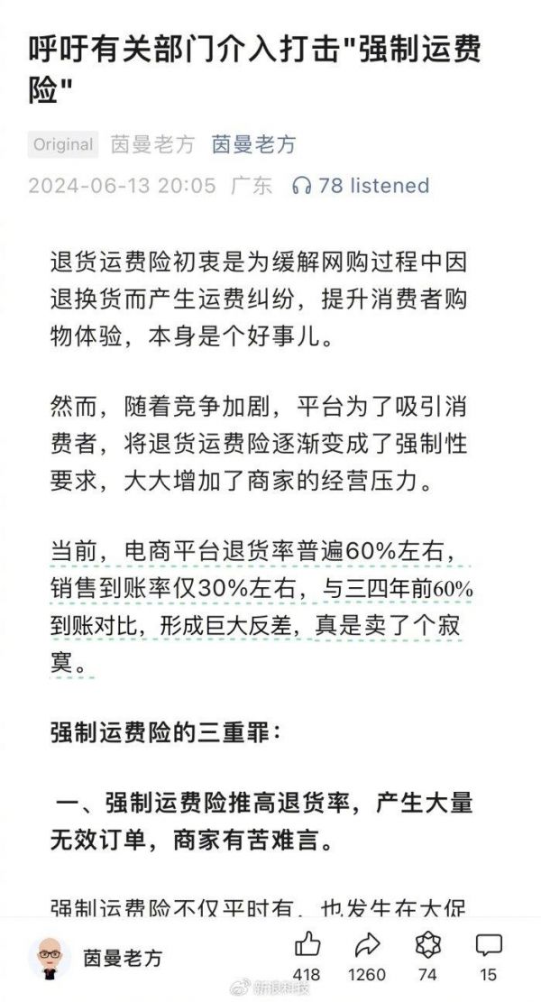 方建华表示,退货运费险初衷是为缓解网购过程中因退换货而产生运费纠纷,提升消费者购物体验,本身是件好事。但随着平台竞争加剧,在电商平台退货率普遍高达60%的情况下,开通运费险还变成商家参加大促活动的强制性要求,为商家运营带来了巨大负担。