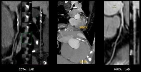 但是到目前为止,冠脉的磁共振成像,一直是临床上的一个技术挑战。因为冠脉走形迂曲,结构细小,受心脏搏动及呼吸影响较大,容易扫描失败率高、扫描时间长、图像不佳,因此在临床很难常规开展。但是基于飞利浦的无液氦2.0双芯磁共振,通过极致均匀的无液氦磁体以及魔方平台的强强硬件组合,大幅改善了冠脉扫描的成功率,极大地提升了扫描速度,并且保证了较好的图像质量。目前无液氦2.0双芯磁共振,可以在无需注射对比剂的前提下,无创、无辐射的带来媲美金标准CTA的检查效果。甚至CTA在遇到钙化斑块时,伪影影响可能过高评估狭窄程度,从而导致狭窄评估可能偏差,但双芯磁共振的冠脉检查能够清晰显示冠脉管腔结构,无伪影影响,狭窄评估更准确。
