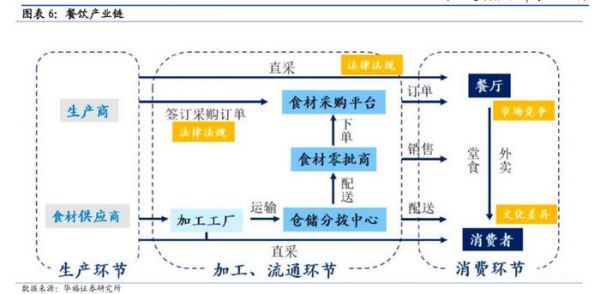 据华福证券研究所研报图片显示,餐饮供应链一般可分为三个部分:生产环节、加工与流通环节、消费环节。但这三个环节中,却可衍生出数十个可产生影响的主体:在生产环节中,涉及生产商和食材供应商;加工、流通环节中,因采购方式的不同涉及法律法规、配送运输、下单采购等多个方面;消费环节中,也会受市场竞争和文化差异等多方面的影响。