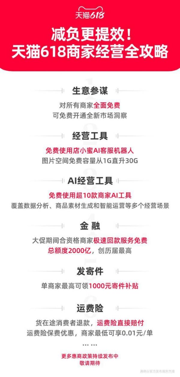 降本增效之外,助力中小商家经营减负也是淘宝的重点。618前夕,包括生意参谋、店小蜜客服机器人、图片空间等重要经营服务即将向商家免费提供。这一系列举措,将惠及淘宝天猫全平台千万商家,帮助商家、尤其是中小商家大幅降低经营成本。