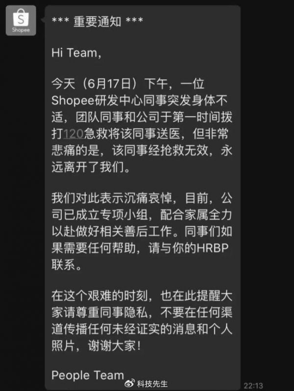 Shopee发布内部通知,确认网传研发中心员工因抢救无效离世