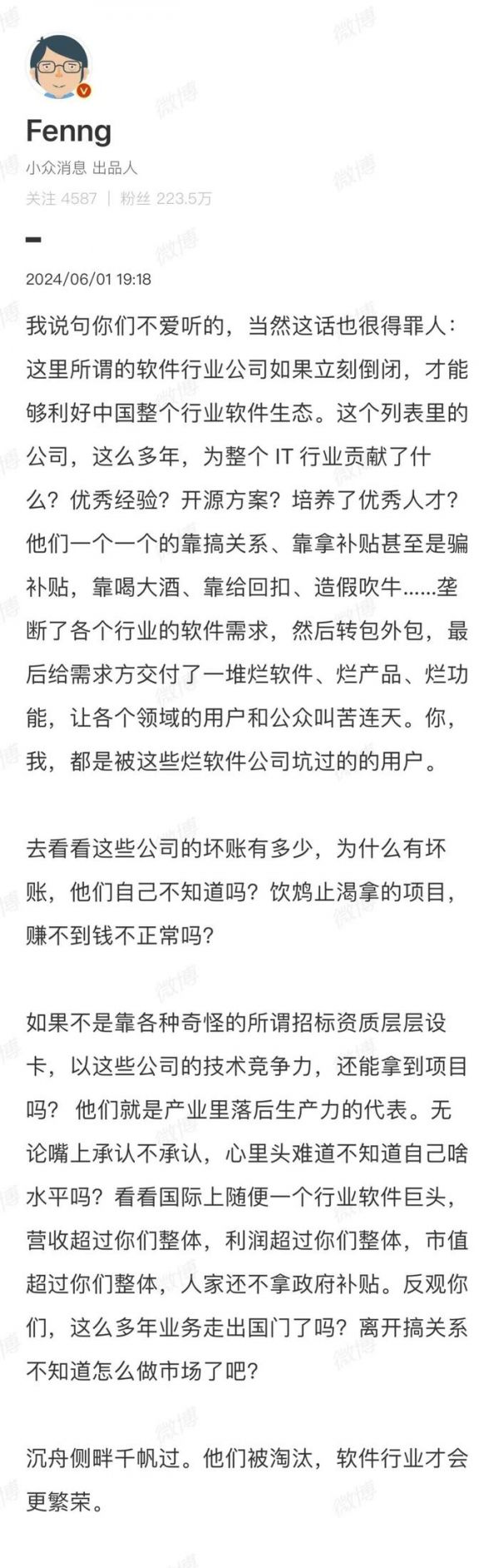 甚至有人提出这样的观点(全文如下):所谓的软件行业公司如果立刻倒闭,才能利好中国整个软件生态……软件公司不赚钱就是由于依靠关系销售、饮鸩止渴造成的。