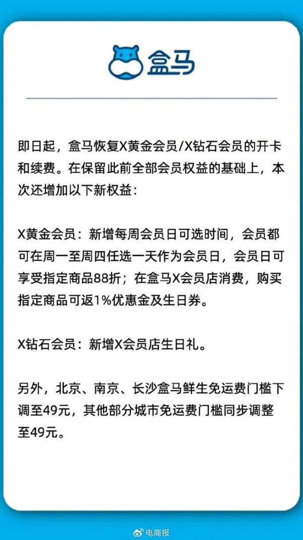 4月24日,盒马官方宣布恢复黄金/钻石X会员的开续卡服务,并在保留原有权益的基础上,增加了新的福利。如黄金X会员(258元/年)新增了生日券、购物返1%优惠金服务,并扩展了会员服务区域至合肥。钻石X会员(658元/年)则享有生日礼、体验月卡等更多特权。此外,所有盒马X会员店VIP也将自动升级为黄金X会员。