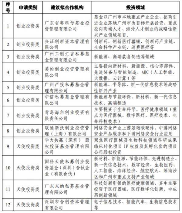 这一次出资,12家拟合作管理机构中创业投资类共计8家,行业涉及创新药、创新医疗器械、创新药产业链、新能源、高端装备制造、新能源、核心零部件、半导体等。