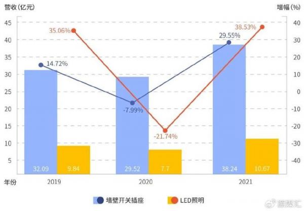 2021年,公牛虽不再单独公布上述两项业务的营收情况,但从增幅比例仍可窥得一二。财报显示,2021年公牛墙壁开关插座及LED照明产品收入同比分别增长29.55%、38.53%,据此推算,该两项产品实现营收分别约为38.24亿元、10.67亿元。相较2019年,彼时公牛该两项主营业务的增幅并不明显。