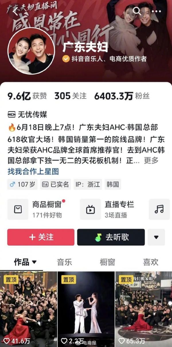 其中,广东夫妇主打销售美妆护肤产品,在抖音平台上累积了超过6400万的忠实粉丝。今年618大促期间,广东夫妇的首场直播成交额为6114万元,尽管与去年同期相比下滑了86.4%,但他们在收官直播中强势反弹,销售额突破亿元大关,整体表现较为稳固。截至昨日下午,广东夫妇暂列抖音带货榜榜首。