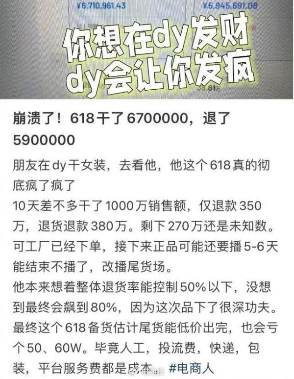 此前,有网友爆料称,其朋友经营的女装网店在618大促期间销售额接近1000万元。但在扣除仅退款的350万元、退货退款的380万元后,再减去各项成本开支,网店预计亏损50万元至60万元。