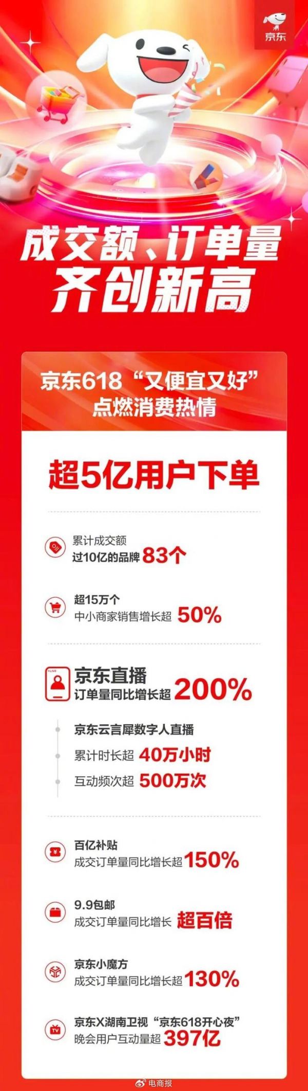 据官方数据显示,截至6月18日23时59分,京东吸引了超过5亿用户下单,成交额和订单量均创下了历史新高。其中,京东直播订单量同比增长超过200%,展现了巨大的市场潜力。