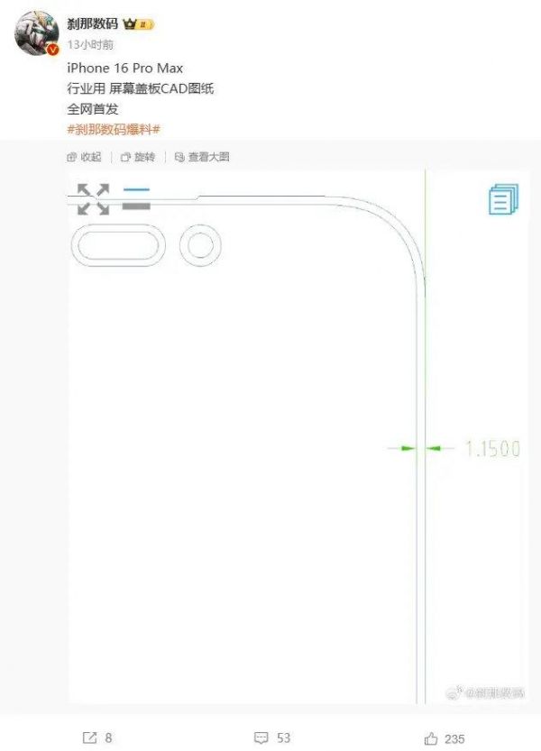 据数码博主爆料,iPhone 16 Pro Max将采用全球最窄的屏幕边框,仅为1.15mm。