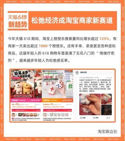 一位在淘宝开了6年文具店铺的商家对记者表示,今年618捏捏乐有明显的爆发趋势,最受欢迎的是饭团、吐司这些食品形状的捏捏乐,一天能卖到上千个。“花上不多的钱就能给自己找一个压力发泄的出口,所以在年轻人中很流行。而且今年618我们店铺也参与了跨店满减和88VIP消费券,这类价格的商品也很适合来凑单。”