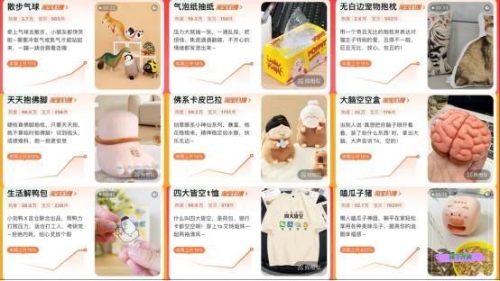 还有一大波奇奇怪怪的商品,被买上了淘宝热搜,从小众隐藏款变成年轻人的时髦单品。比如“大脑空空盒”、“天天抱佛脚”、 “精神状态贴纸”主打解压;“磕瓜子猪”、“万物可取手”主打毫不费力,可可爱爱的“散步气球”、“无边宠物抱枕”、“佛系卡皮巴拉”更是情绪价值拉满。