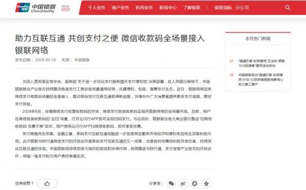 据中国银联官方网站6月19日消息,在人民银行指导下,中国银联联合产业各方持续推动各类支付工具在各场景通用好用,共建便利、包容、普惠支付生态。近日,银联网络迎来微信支付收款码场景的全面接入,推动条码支付互联互通取得新进展,为境内外广大消费者提供更多支付选择、更好支付体验。