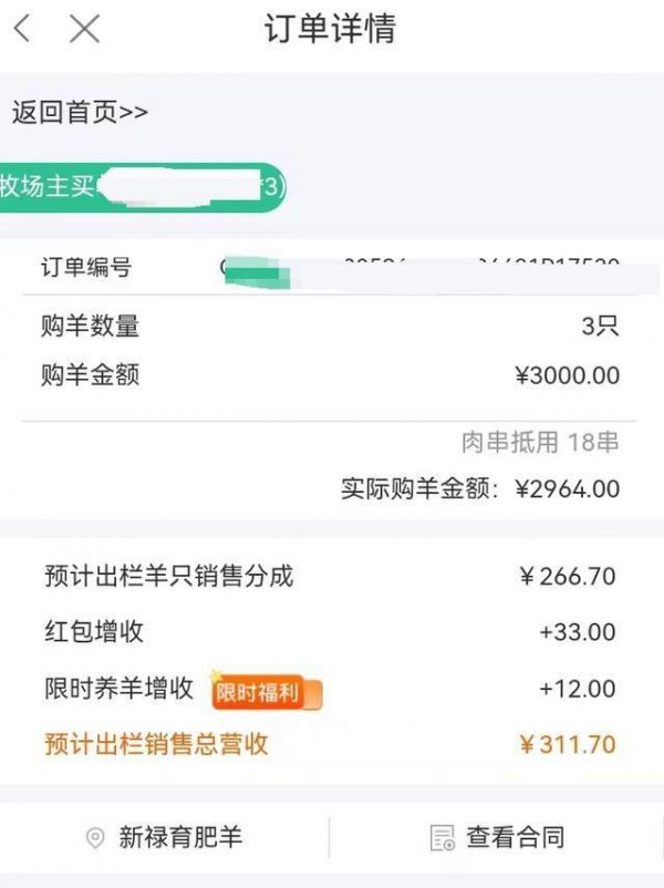 一名众牧宝投资者发来的订单截图上述投资者给记者发过来的一张订单截图显示,3只羊对应的购羊金额是3000元,对应的预计出栏销售总营收为311.7元。下单时间是2024年2月,预计出栏时间是2025年2月。也就是说,这笔投资的预计年化收益率约为10.4%。